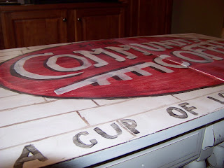 I decided I wanted to take inspiration from Funky Junk Interiors and make a table with an old sign look.  I thought for two days about what sign to use.  I looked up mechanic signs (Mr. TSL is a mechanic and loves cars/trucks)  Then it came to me...how about an old coffee sign?  Ironic for a coffee table right?